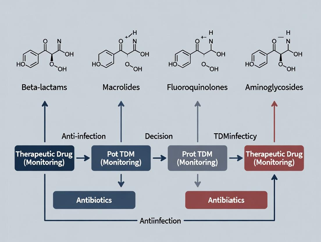Integrating the concepts of time-dependent and concentration-dependent killing is paramount for designing effective TDM protocols. For β-lactams, TDM should focus on maintaining free drug concentrations above the MIC for a sufficient portion of the dosing interval, often advocating for prolonged infusions. For drugs like aminoglycosides and fluoroquinolones, TDM targets are based on achieving specific peak/MIC or AUC/MIC thresholds, supporting high-dose, infrequent regimens. This mechanistic PK/PD understanding provides the rational framework for tailoring TDM across antibiotic classes to optimize patient outcomes and steward antimicrobial efficacy.
