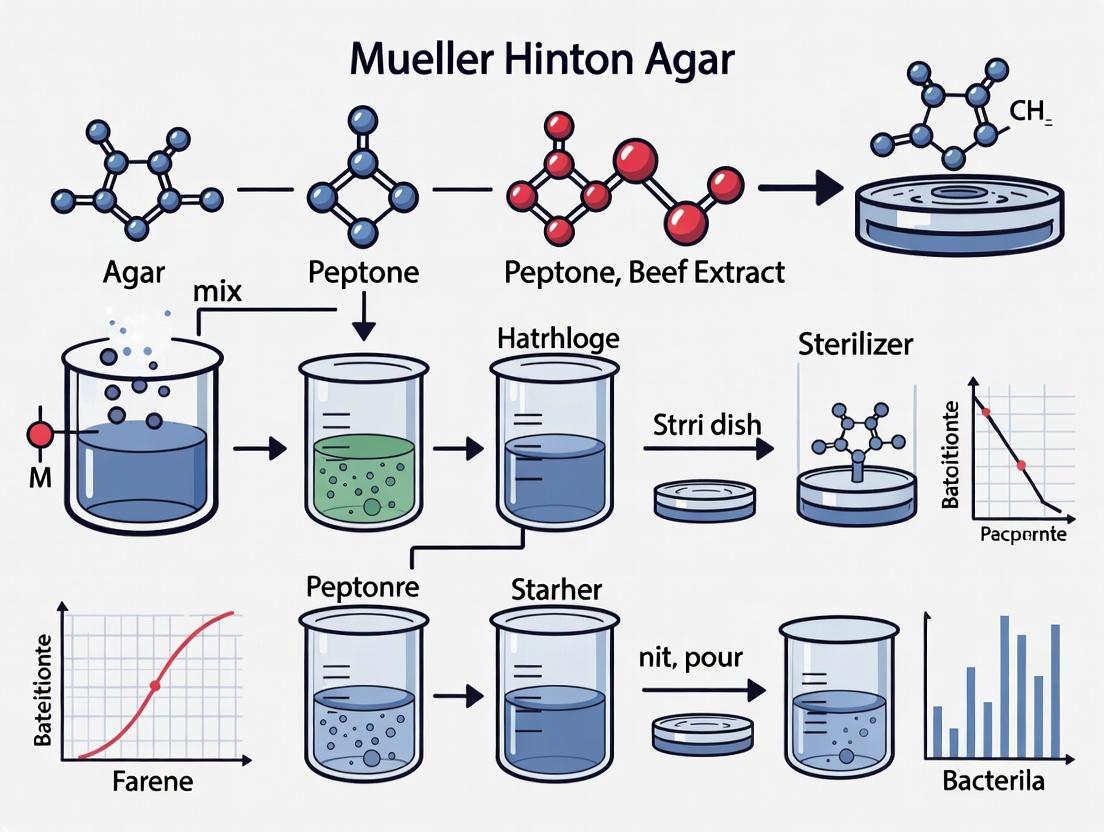 Within the context of research utilizing the well diffusion method, the preparation and standardization of Mueller Hinton Agar (MHA) is not merely a preliminary step but a fundamental determinant of experimental validity. As the gold-standard medium for AST per CLSI and EUCAST guidelines, MHA’s unique composition provides a reproducible, low-antagonist environment that allows for the accurate diffusion of antimicrobials and unimpeded bacterial growth. This application note details the critical protocols and specifications for MHA preparation in research settings, ensuring data integrity for researchers and drug development professionals.